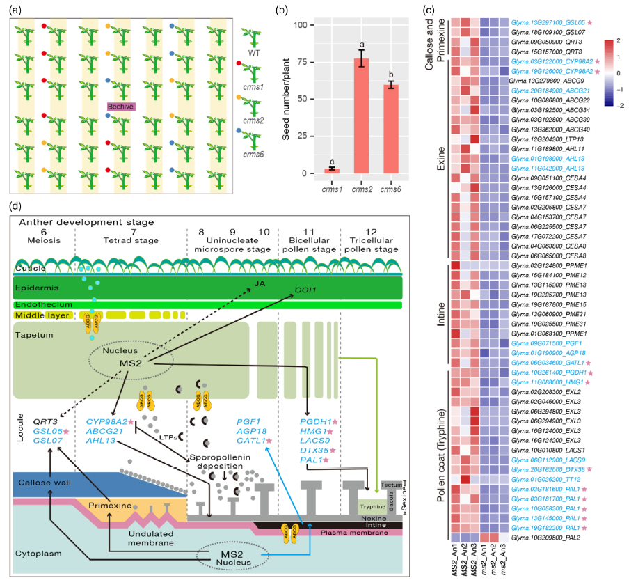 结果:(1)MS2在绒毡层和小孢子中通过直接调控参与次级代谢物生物合成和脂质代谢的基因发挥作用,而脂质代谢是小孢子细胞壁形成所必需的。(2)通过与相同遗传背景下广泛使用的雄性不育突变体的田间表现比较,我们证明ms2突变体的异交率最好,是构建经济高效的大豆杂交体系的理想工具。