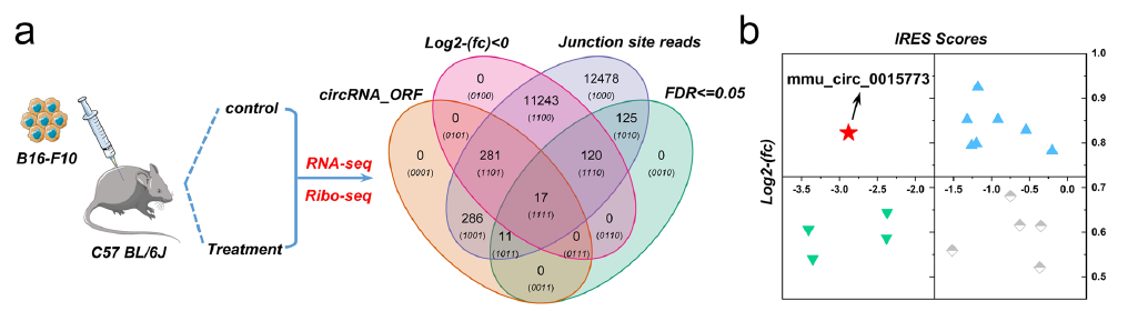 图1 a.通过RNA-seq和Ribo-seq筛选到17个候选circRNA;b.使用IRES评分和差异指数进一步鉴定高蛋白编码潜力的circRNA