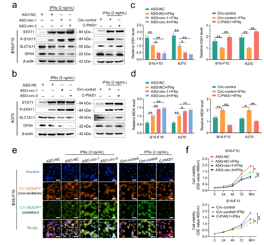 研究表明,用ICB治疗后,活化的CD8T细胞会产生高水平的IFNγ进而促进STAT1磷酸化,抑制SLC7A11/GPX4信号通路,并诱导黑素瘤中的铁死亡。因此,作者推测circPIAS1-108aa可能通过抑制这种特异性通路来抵消IFNγ的影响。通过检测IFNγ诱导下circPIAS1敲低或过表达对P-STAT1/SLC7A11/GPX4信号通路、GSH和MDA水平以及细胞膜脂质过氧化损伤的影响发现,circPIAS1-108aa确实可通过抑制STAT1磷酸化来抵抗IFNγ诱导的免疫性铁死亡,这反过来降低了ICB治疗的有效性。