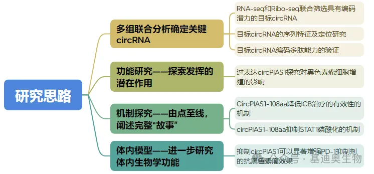 在这篇文章中,作者巧妙地利用RNA-seq、Ribo-seq和质谱技术,对黑色素瘤肿瘤组织进行分析,并发现了circPIAS1这个在黑色素瘤中高表达且具有编码蛋白的潜力的circRNA。后续通过一系列实验发现,circPIAS1是限制黑色素瘤免疫治疗效果的关键因素。抑制circPIAS1可以增强PD-1抑制剂的抗黑色素瘤作用,为提高ICB治疗效果提供了新的策略。