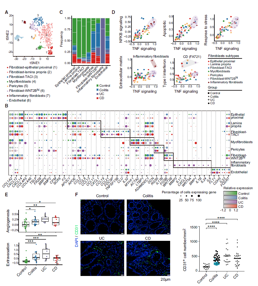 3. 成纤维细胞以及皮细胞子亚群分析——儿童结肠炎及炎症性肠病结肠黏膜富集炎性成纤维细胞且血管生成增加