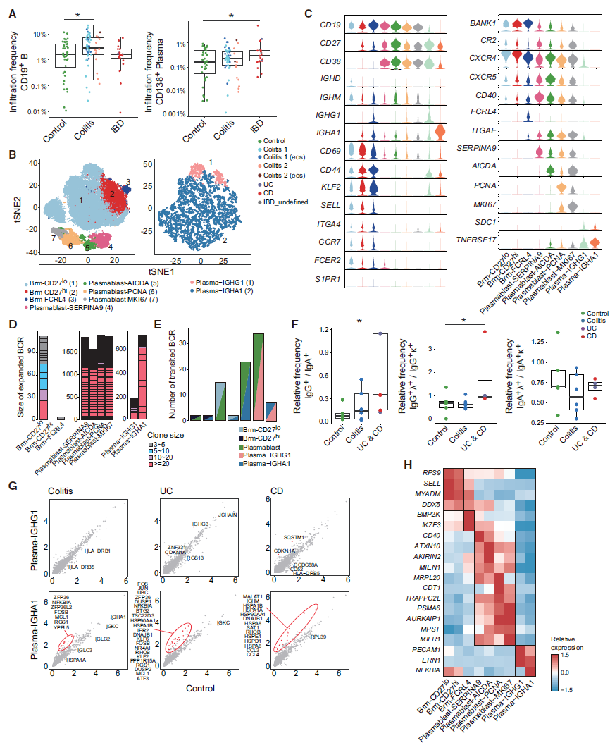 作者对两类B细胞分别开展讨论和分析:组织驻留的记忆B细胞(可以转化为浆细胞)以及浆细胞(即效应B细胞)。相对对照组,作者发现CD19+ 记忆B细胞在结肠炎组比例显著上升,分化后的B细胞——CD138+浆细胞则在IBD组显著上升(图5A)。通过子亚群分类,CD19+ B细胞分为了7个子亚群,CD138+浆细胞分为了2个子亚群(图5B),同样也分析讨论了这些子亚群的关键标记基因(图5C)。对于B细胞,该研究同时进行了单细胞BCR免疫组测序。 分析发现,在Brm-CD27lo, plasmablast(浆母细胞)和plasma cells(浆细胞)中BCR的克隆显著扩增(具有更多的BCR种类)。通过分析记忆B细胞和浆细胞共有的BCR种类所占比例,推测浆细胞的转化来源。分析发现大部分浆细胞是由Brm-CD27lo类型的记忆B细胞转化而来的(图5E)。在PIBD患者(UC和CD)组,lgG+ 浆细胞比例显著上升,这与之前报道lgG+ 浆细胞会促进PIBD病程发展一致(图5F)。最后,作者重点关注了浆细胞中在病例组高表达的与NF-kB激活相关的基因(图5G-H)。 |