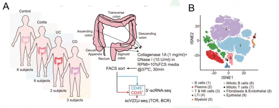 为了阐述不同亚型病例的致病机制并寻找治疗靶点,研究团队对17名患儿(对包括对照组在内的四组取样,如下图A)的结肠黏膜进行取样测序。研究采用FACS方法分离免疫细胞和非免疫细胞,然后进行单细胞转录组及TCR+BCR测序(针对CD45+免疫细胞同时开展转录组和免疫组库测序)。