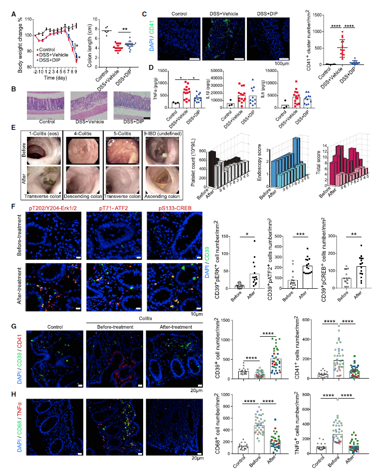 研究团队利用腹腔注射双嘧达莫的方式对硫酸葡聚糖(DSS)诱导的急性肠炎小鼠进行了治疗,发现双嘧达莫可以显著改善小鼠的体重、结肠长度和结肠的组织病理结构,抑制小鼠结肠黏膜的血小板聚集和TNFα的释放(图7A-D)。