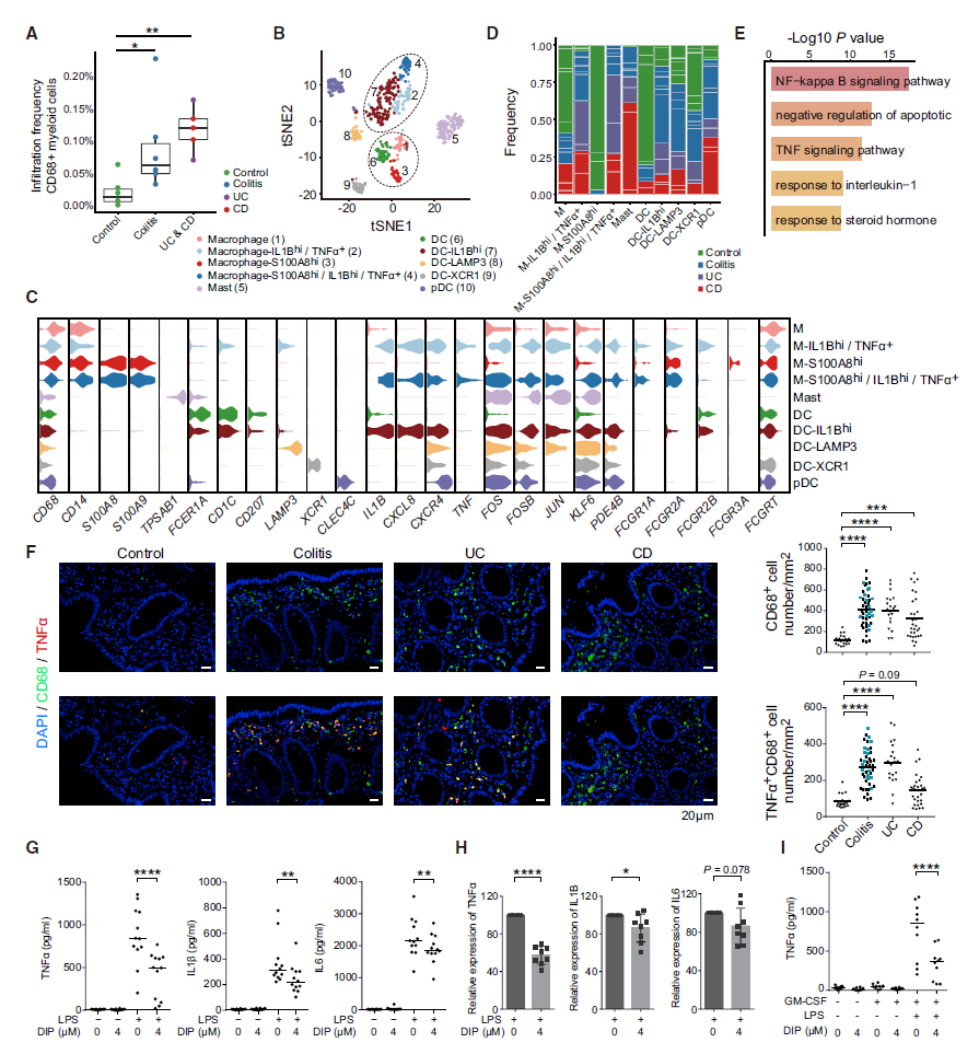 4. 髓系细胞子亚群分析——儿童结肠炎及炎症性肠病结肠黏膜富集高炎性髓系细胞 髓系细胞在患者组中的比例显著要高于对照组(图4A)。髓系细胞全部可表达CD68,可以分为10个子亚群。通过亚群特异表达基因的pathway富集分析,作者定位了几个值得关注的核心通路(图4E),例如NF-kappa B signaling pathway, TNF signaling pathway等。 |