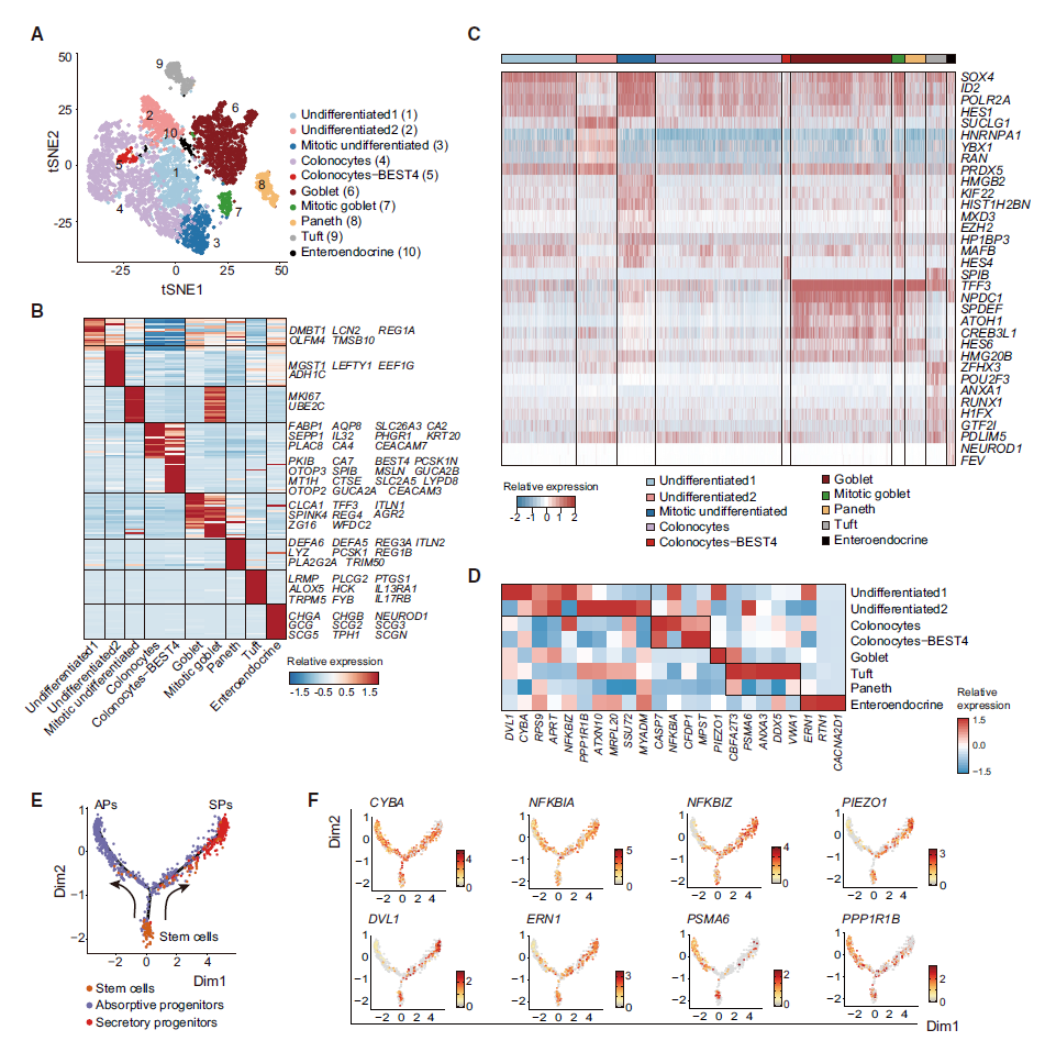 将上皮细胞分为了10个子亚群(图2A),值得关注的是其中有两个子亚群没有被鉴定。结合单细胞子亚群分析结果,作者还讨论了PIBD风险基因(来源GWAS结果)在各个子亚群细胞以及分化轨迹中的表达情况(图2D、F)。比如CASP7特异表达与结肠上皮细胞(colonocytes),已报道可能引起肠上皮(coloncytes)凋亡;PIEZO1特异表达在Goblet细胞上,与激活的离子通道相关。 通过这一步简单的分析,就实现了传统GWAS分析与单细胞转录组数据的关联。 |