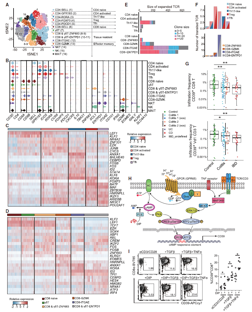 6.T细胞、NK细胞的子亚群分析——单细胞转录组以及TCR免疫组库分析 对于T细胞和NK细胞,一共又可以分为16个子亚群(图6A),作者同样整理了子亚群特异表达的基因(图6B),尤其是子亚群特异表达的转录因子(图6C-D)。类似B细胞分析,作者也分析了两大类T细胞(CD4+和CD8+)中TCR的多样性(图6E),以及通过分析不同类型T细胞共有的TCR,推测它们的转化关系(图6F)。 值得关注的是,细胞表面表达的核酸水解酶CD39 (由ENTPD1编码) 在CD8+和Vδ1+T细胞的表达在PIBD各亚型中显著降低(图6G)。为了寻找与ENTPD1相关的基因,作者采用共表达分析的方法,发现GPR65, CD247 (编码TCR zeta 链),和MAP3K8 三个关键基因与ENTPD1表达正相关。 |